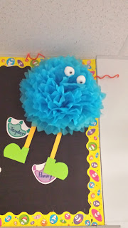 Last year I had my first grade students paint these monsters with crayon resistance. I saved them over the summer and added them to my board. I'm moving up a grade so when they come on Back to School night they will get to see their monsters on the wall. My daughter, Abby, hung this all up for me. What a big helper.